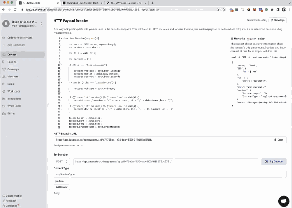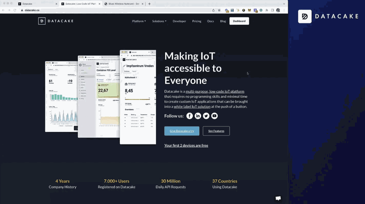 After configuring your Notecard, the next step is to visualize your data. This is where Datacake comes into play. Datacake is a low-code IoT platform that allows you to create dashboards and manage your IoT devices effortlessly.