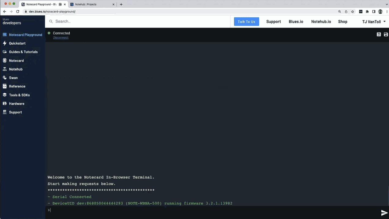 Let’s get started with setting up your asset tracker using the Notecard. To begin, you’ll need to configure the Notecard with a few simple JSON commands. This can be done through the In-Browser Terminal available on the Blues Developer Center.