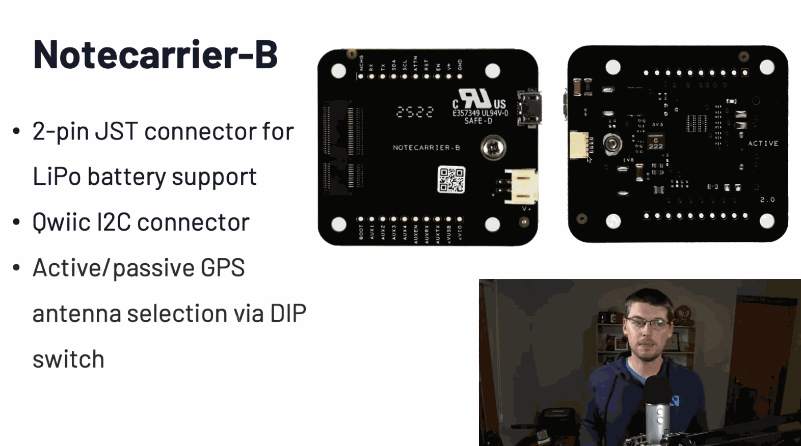 Next, meet the Notecarrier F, designed for Adafruit Feather-compatible microcontrollers. It offers improved power efficiency and convenience features, including labeled pins for easy access. The F is an upgrade from the previous Notecarrier AF and is my personal favorite for building with a Notecard.