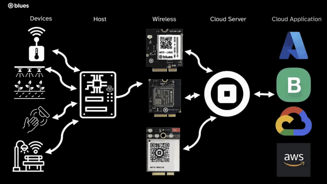 Blues provides an end-to-end communication channel that starts from your device to the Notecard, which supports Cellular, Wi-Fi, or LoRa connectivity. Our goal is to simplify complex workflows while offering customization for developers. Think of Blues as your infrastructure for wireless IoT, enabling secure and efficient bidirectional data syncing between your cloud and devices.