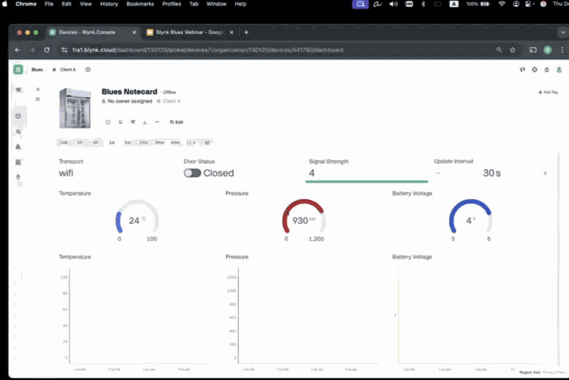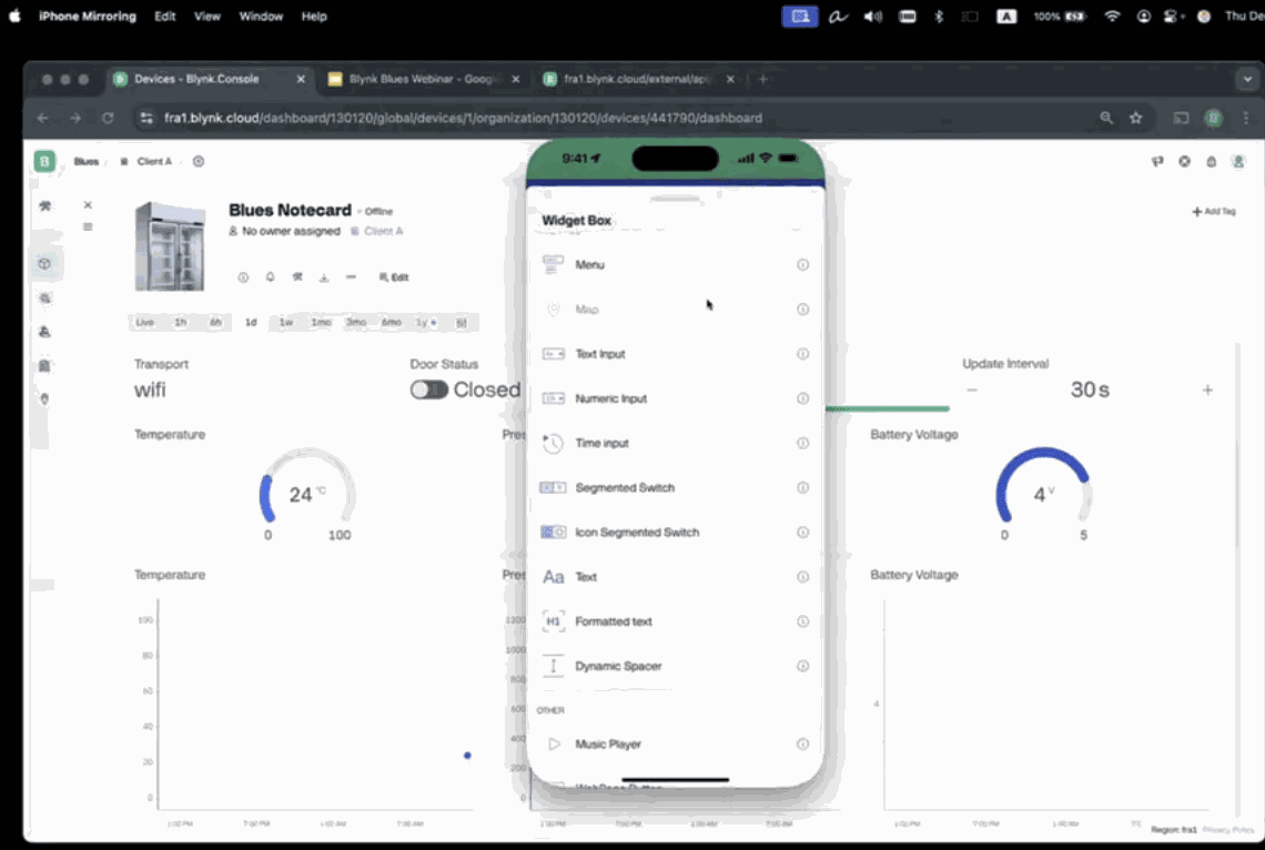 Blynk’s dashboard provides real-time updates on device status. As we demonstrated with the refrigerators, users can see alerts and manage device settings directly from the dashboard, allowing for a seamless user experience.